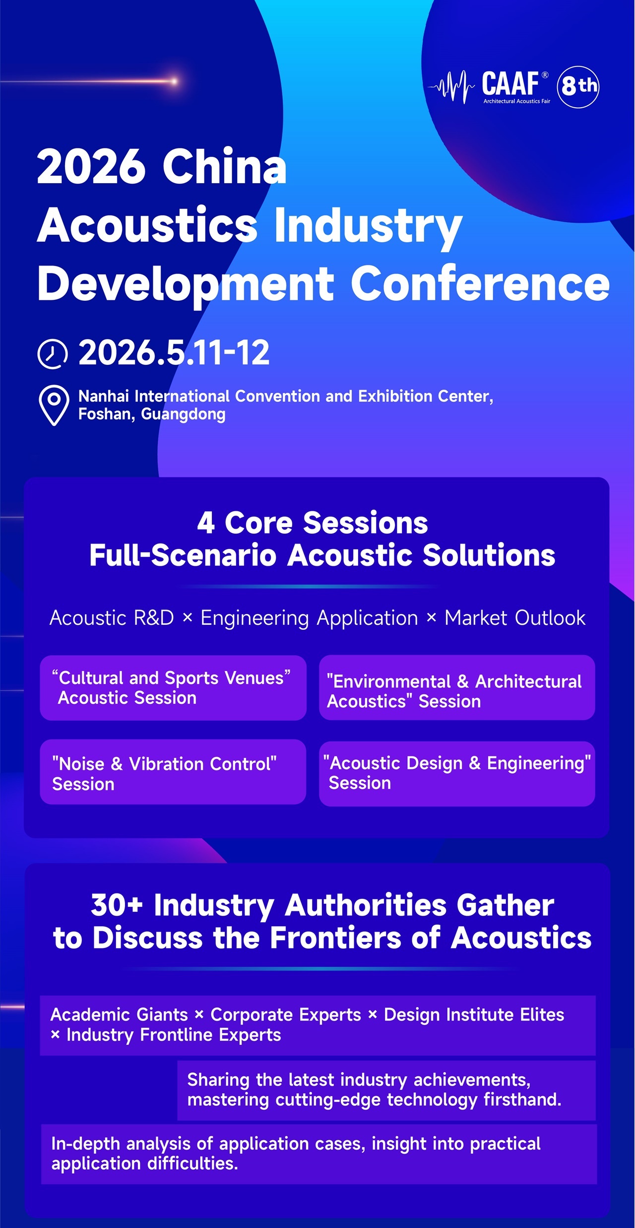 The organizing committee of the 8th China Acoustics Industry Expo (CAAF 2026) has officially released the agenda for its flagship concurrent event — the China Acoustics Industry Development Conference, set to take place on May 11–12, 2026, at the Foshan Nanhai International Convention and Exhibition Center.